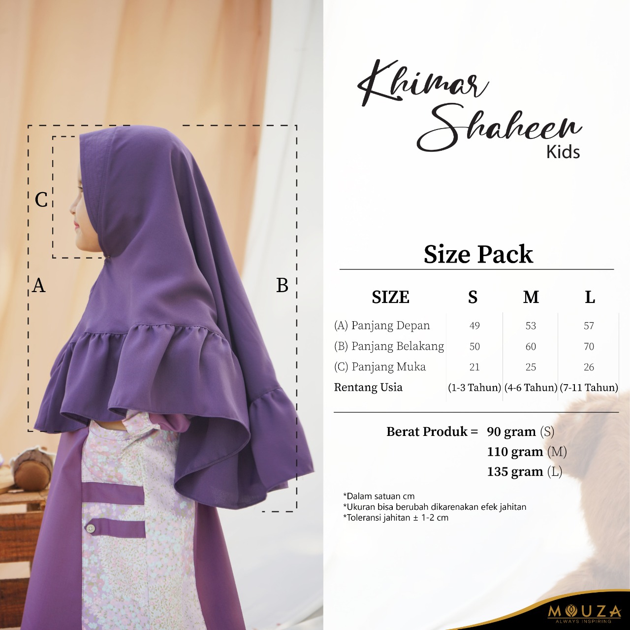 Khimar Shaheen Kids bermaterial Elena Crepe. Memiliki serat mirip wolycrepe dengan struktur kain lebih lembut, empuk ketika dipegang, dan tidak kaku.