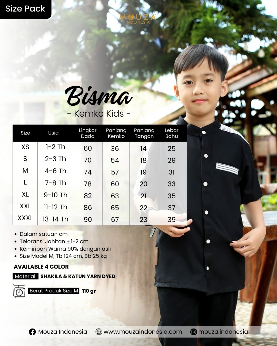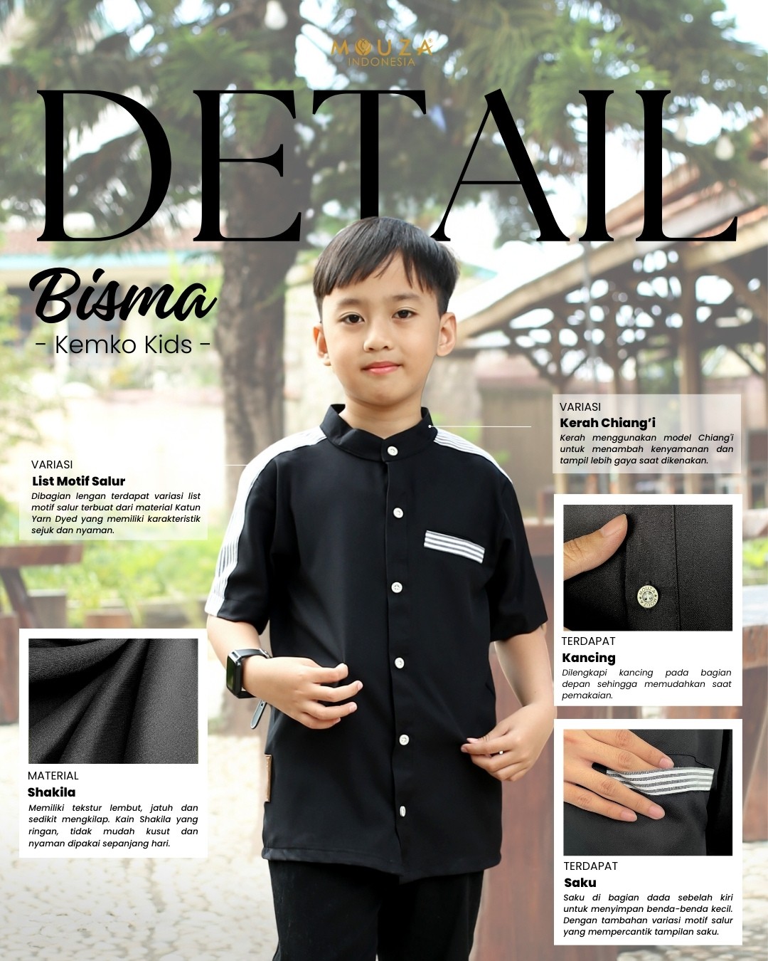 - Bisma Kemko terbuat dari material Shakila yang memiliki tekstur lembut, jatuh dan sedikit mengkilap. Kain Shakila yang ringan, tidak mudah kusut dan nyaman dipakai sepanjang hari.