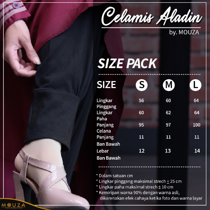 - Celamis Aladin By Mouza atau Inner Pants adalah celana dalaman gamis yang berbahan Polyester Soft 30s yang nyaman dipakai, lembut, dan tidak nerawang sehingga sangat nyaman ketika digunakan.