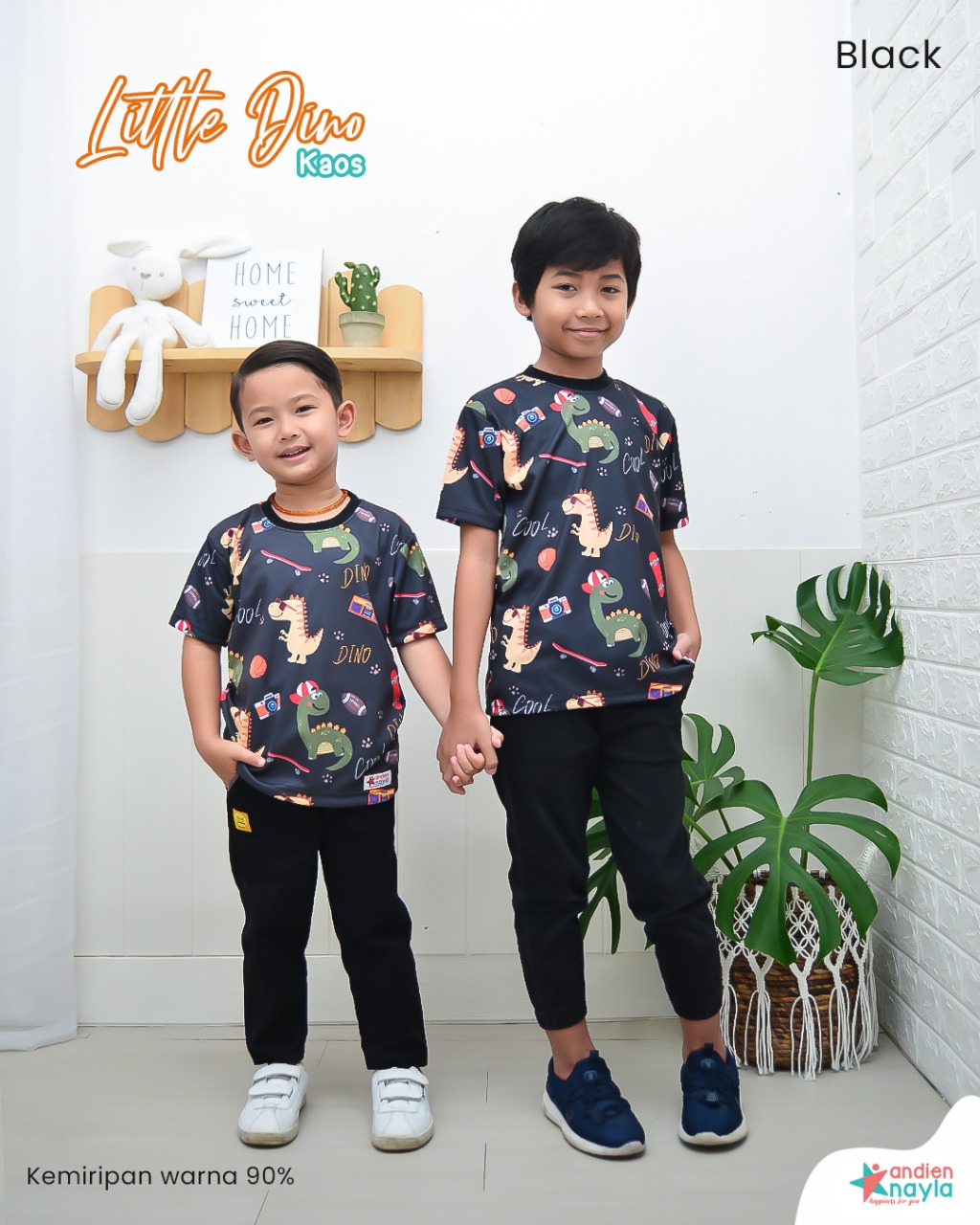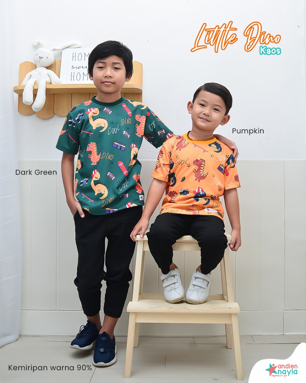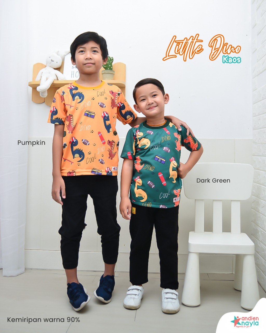 Gambar motif bertemakan dinosaurus yang lebih bervariatif dari kaos dino sebelumnya membuat tampilan si kecil semakin lucu dan menggemaskan.