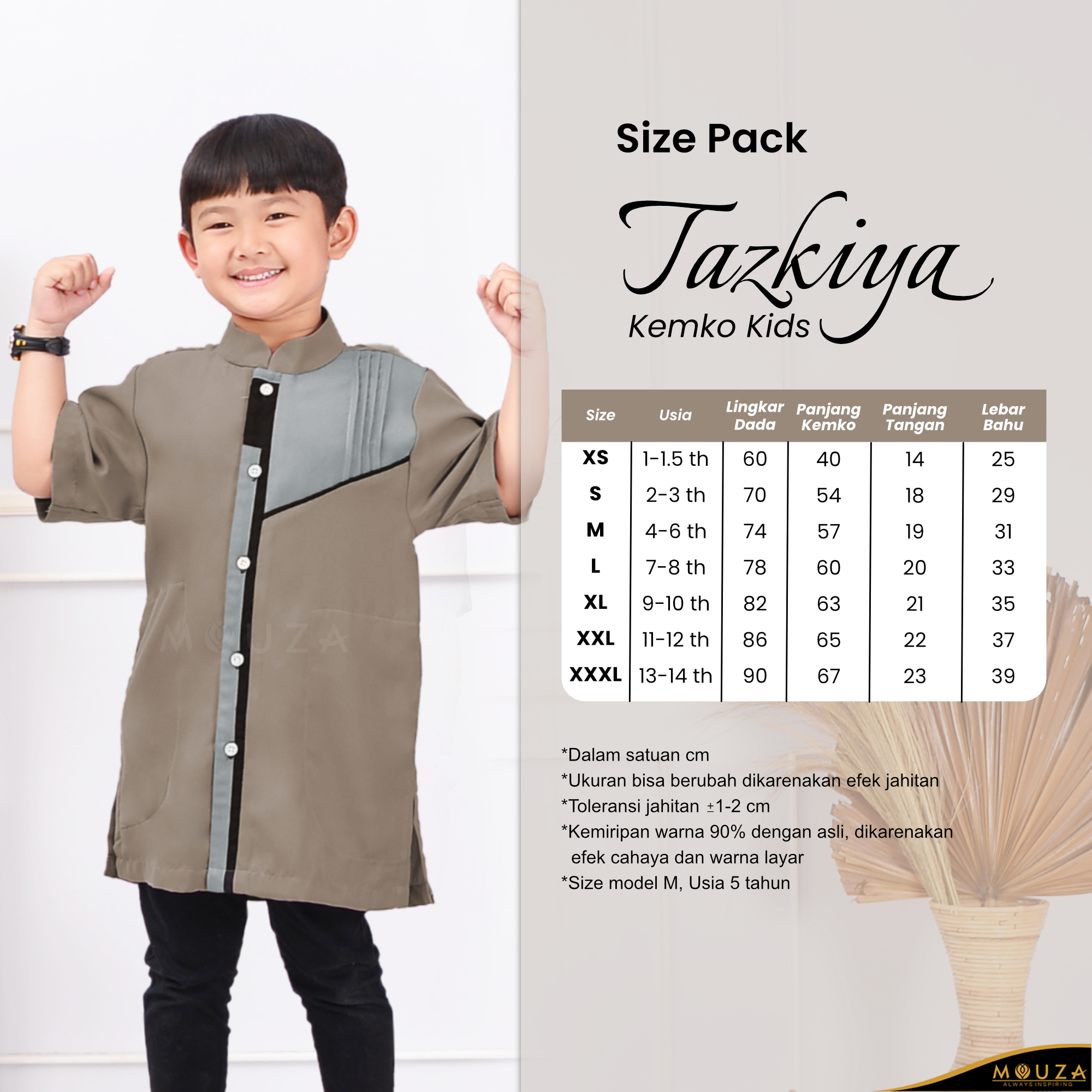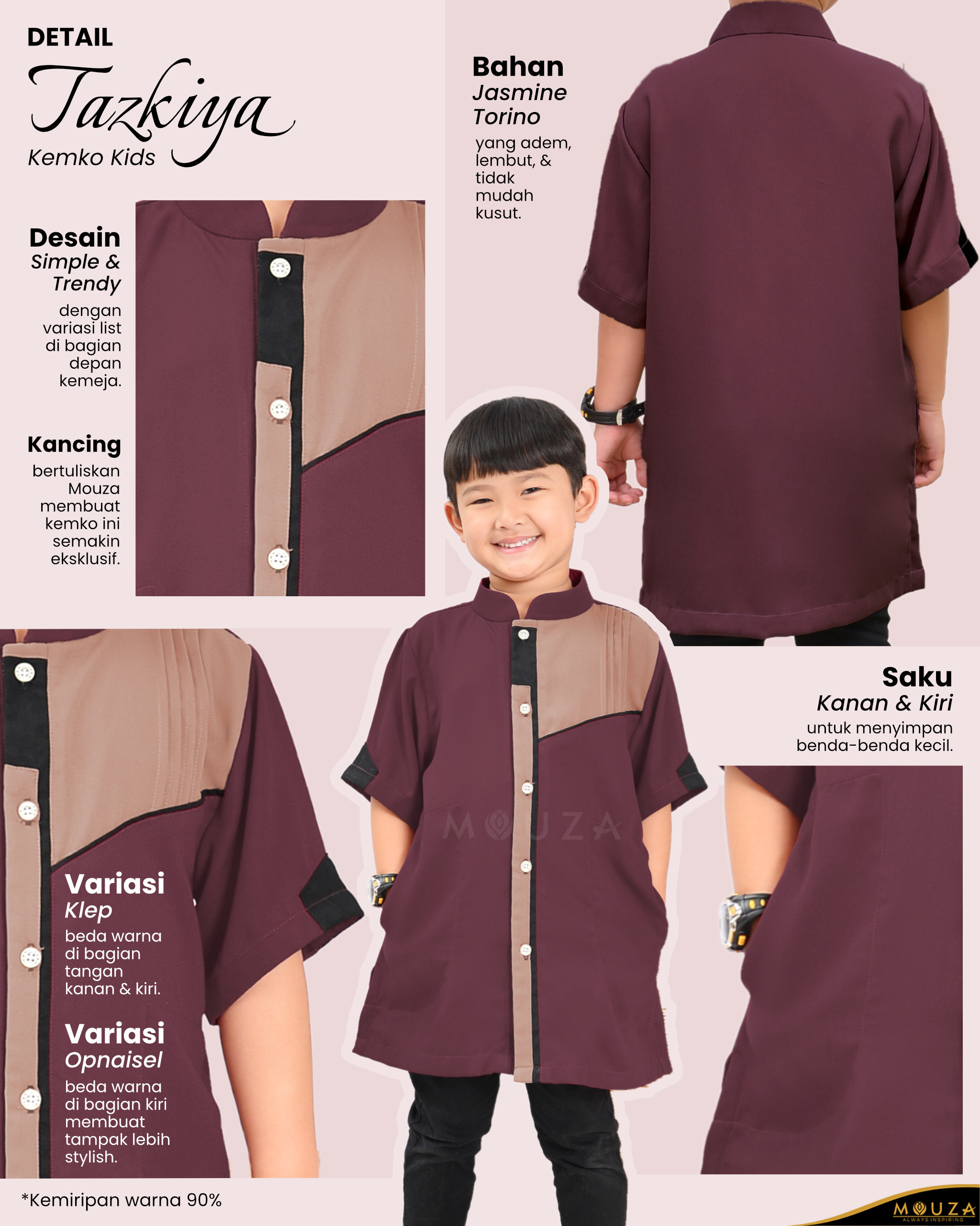 Terdapat kancing yang dapat menyesuaikan bentuk tubuh ketika akan dikenakan. Kancing bertuliskan Mouza membuat kemko ini semakin eksklusif.