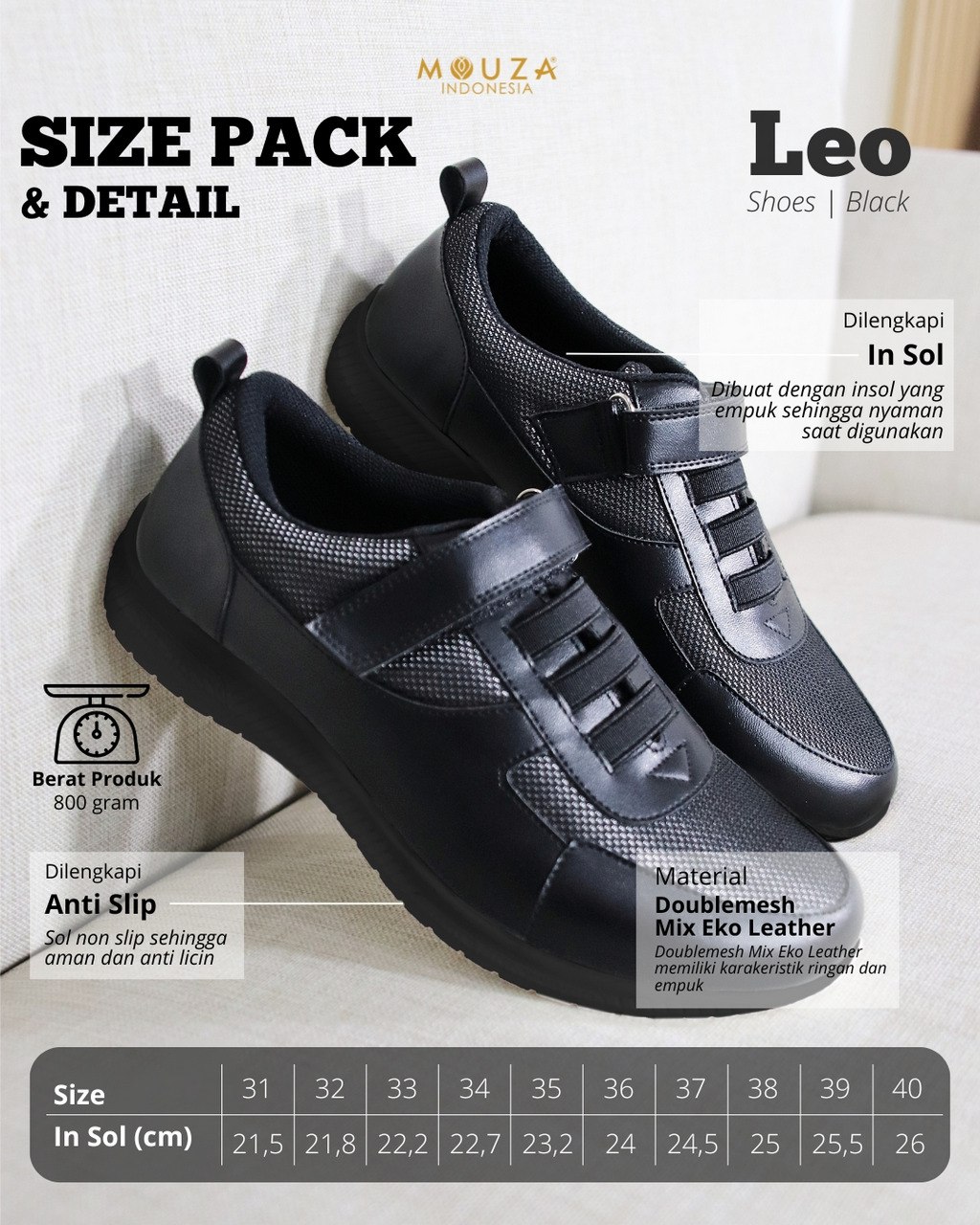 - Leo shoes bermaterialkan doublemesh mix eko leather sintetis dikenal ringan dan empuk sehingga sangat nyaman saat digunakan.