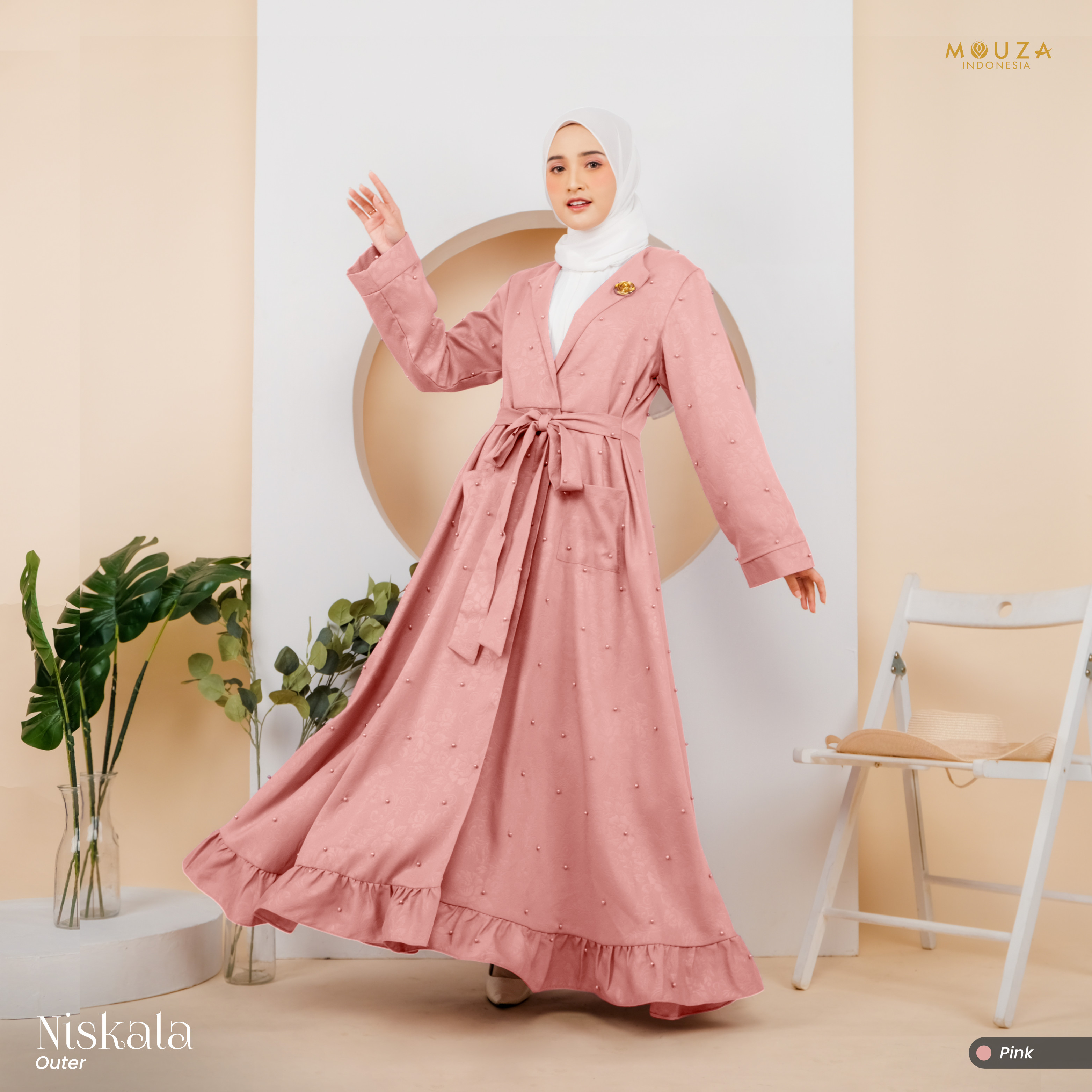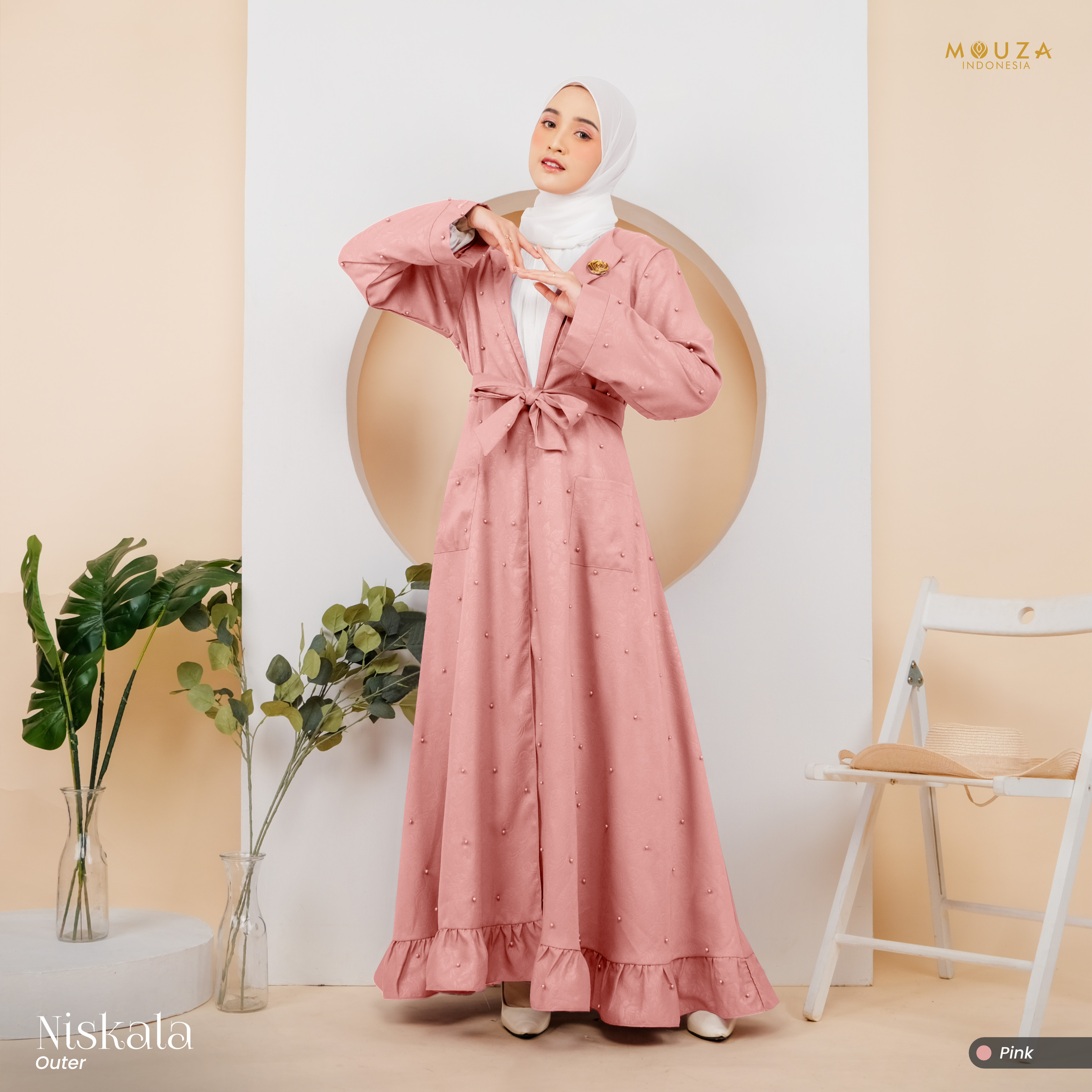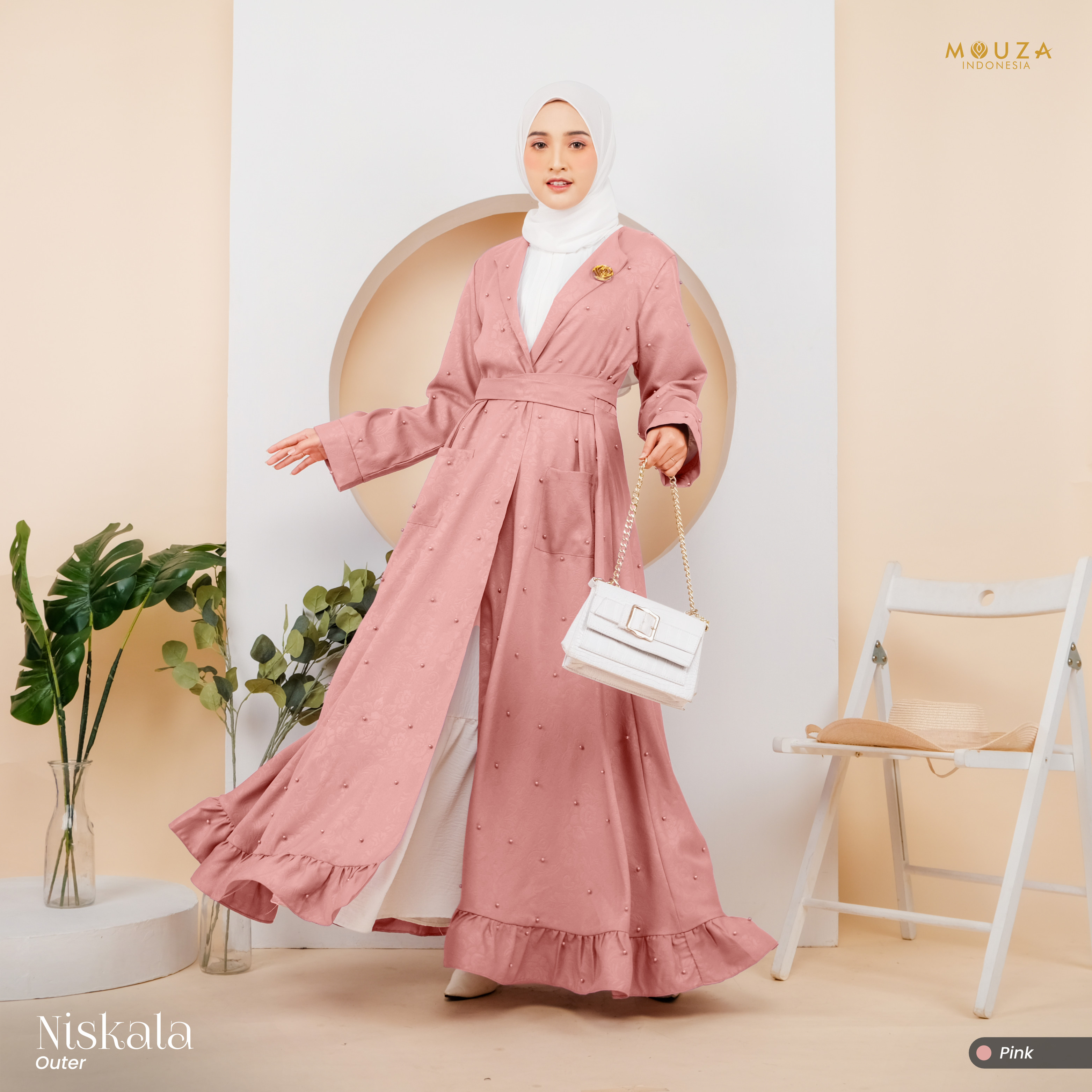 ? Menggunakan material Mosecrepe Embos Mutiara dengan karakteristik bahan yang lentur, nyaman, sangat mudah disetrika, mengkilap dan terkesan elegan dengan tambahan variasi mutiara yang dipadukan dengan brukat Vanci Gliter yang membuat outer ini tampak lebih mewah.