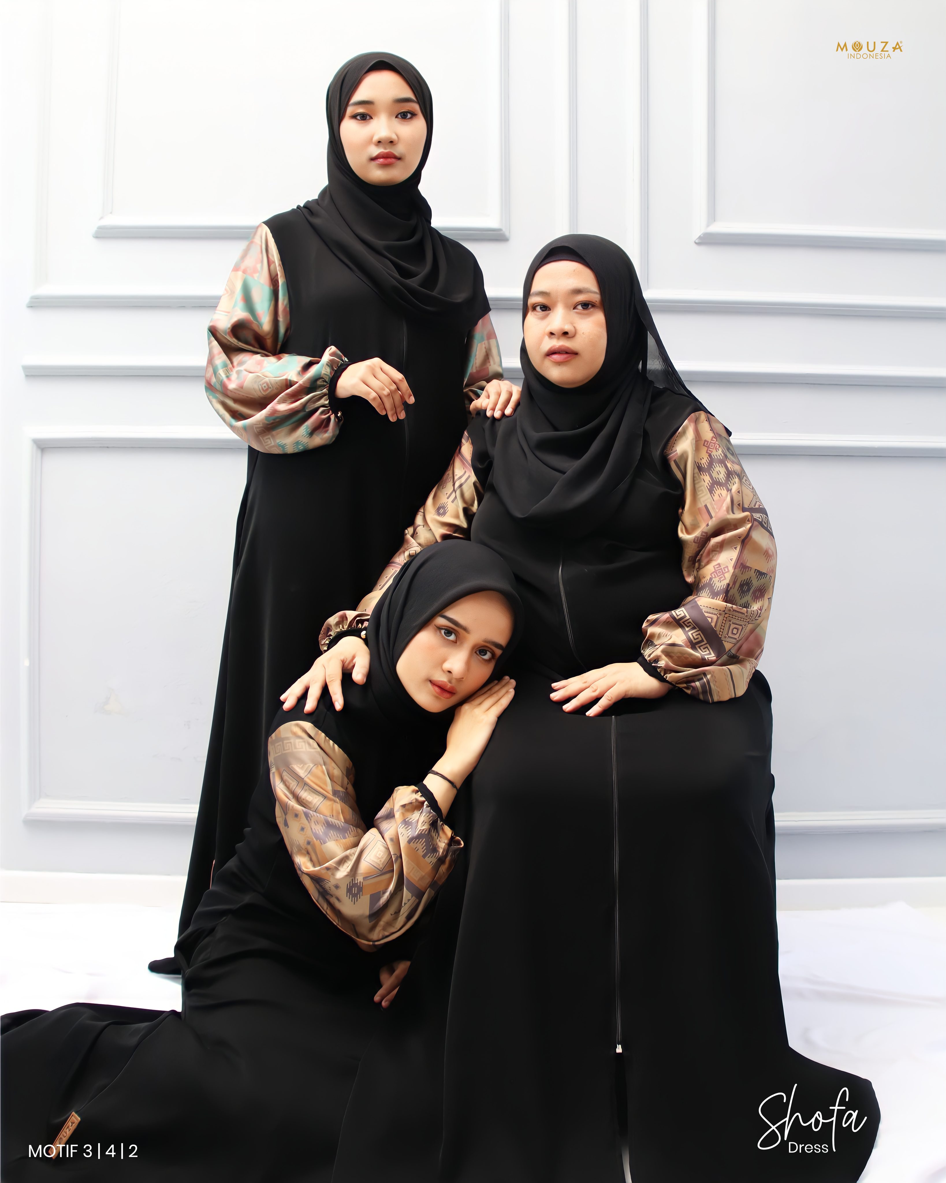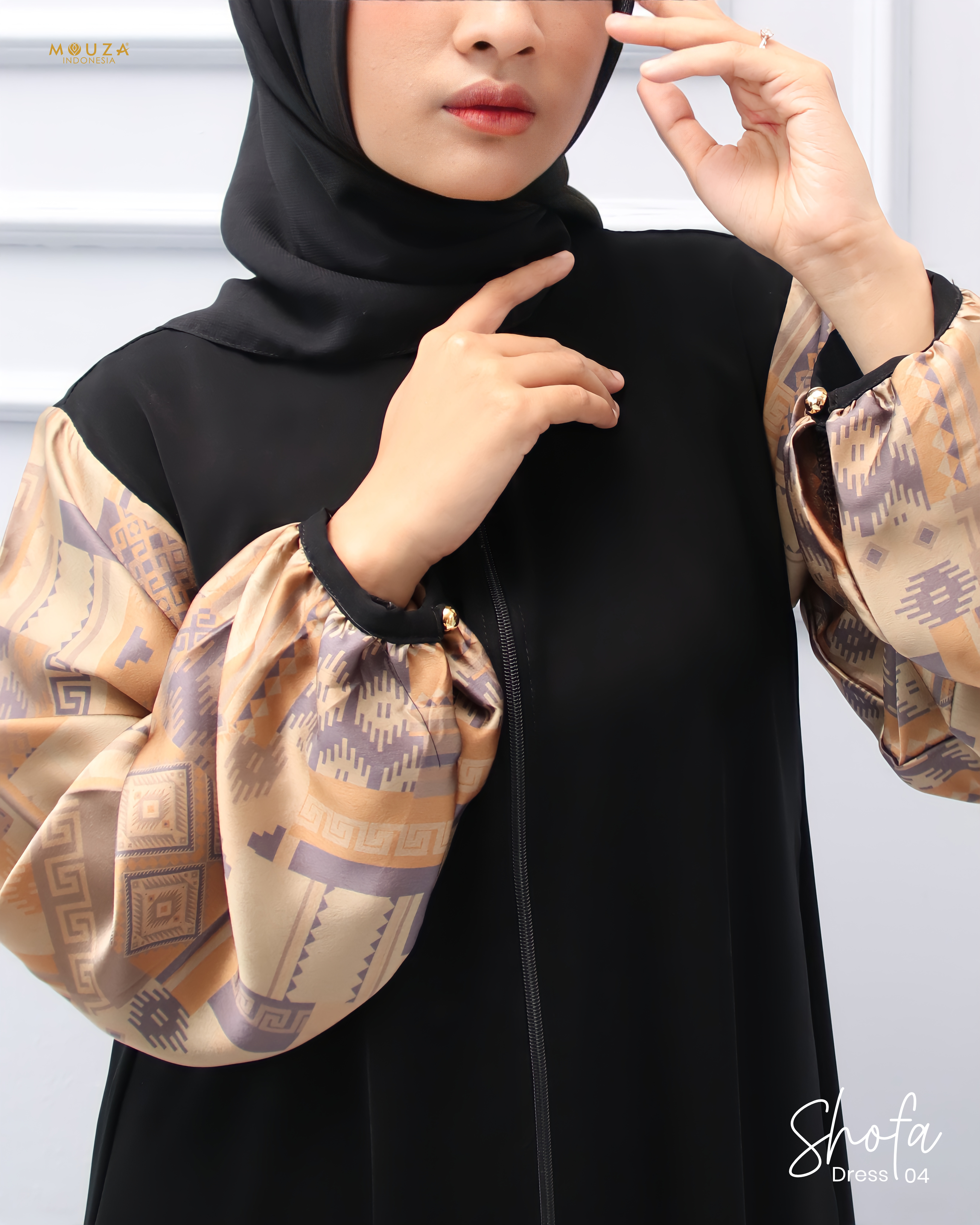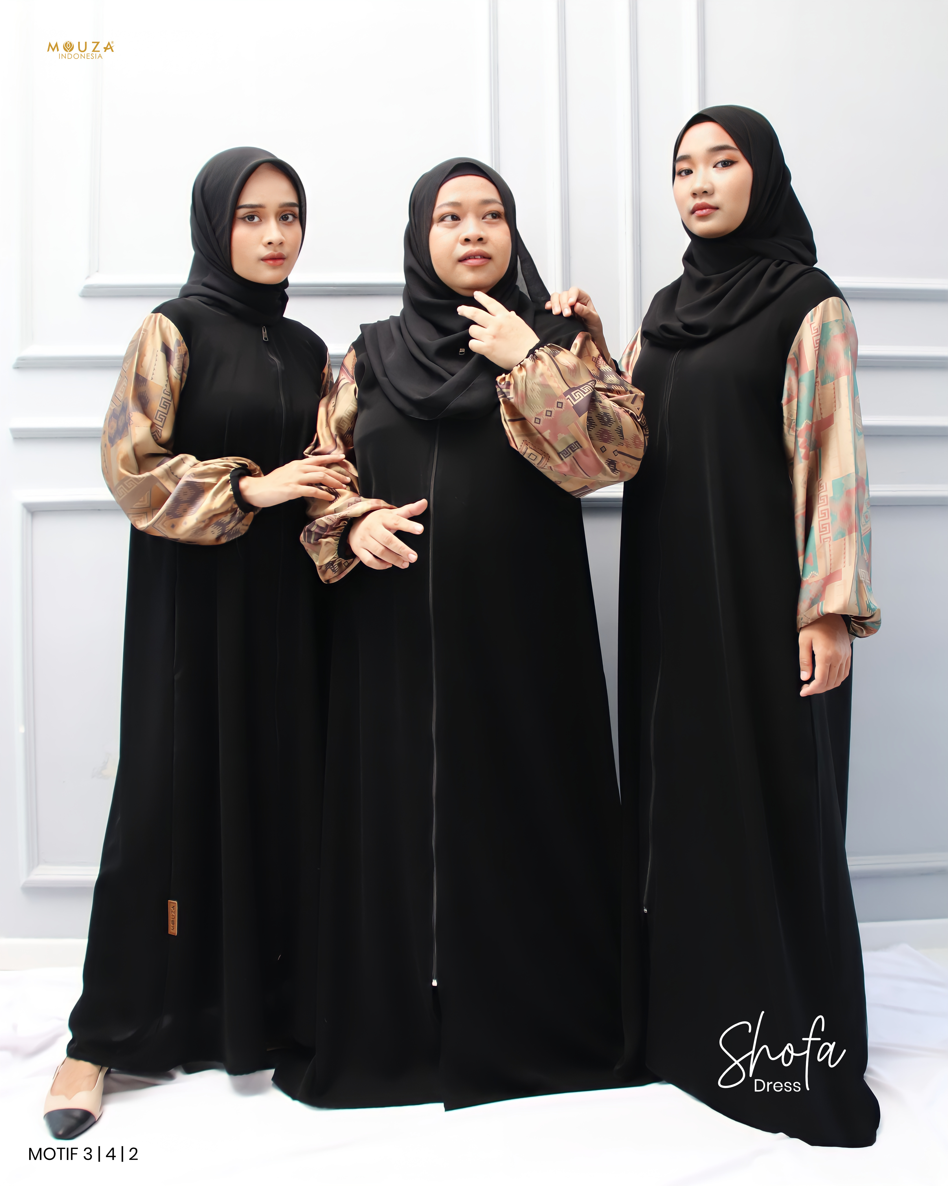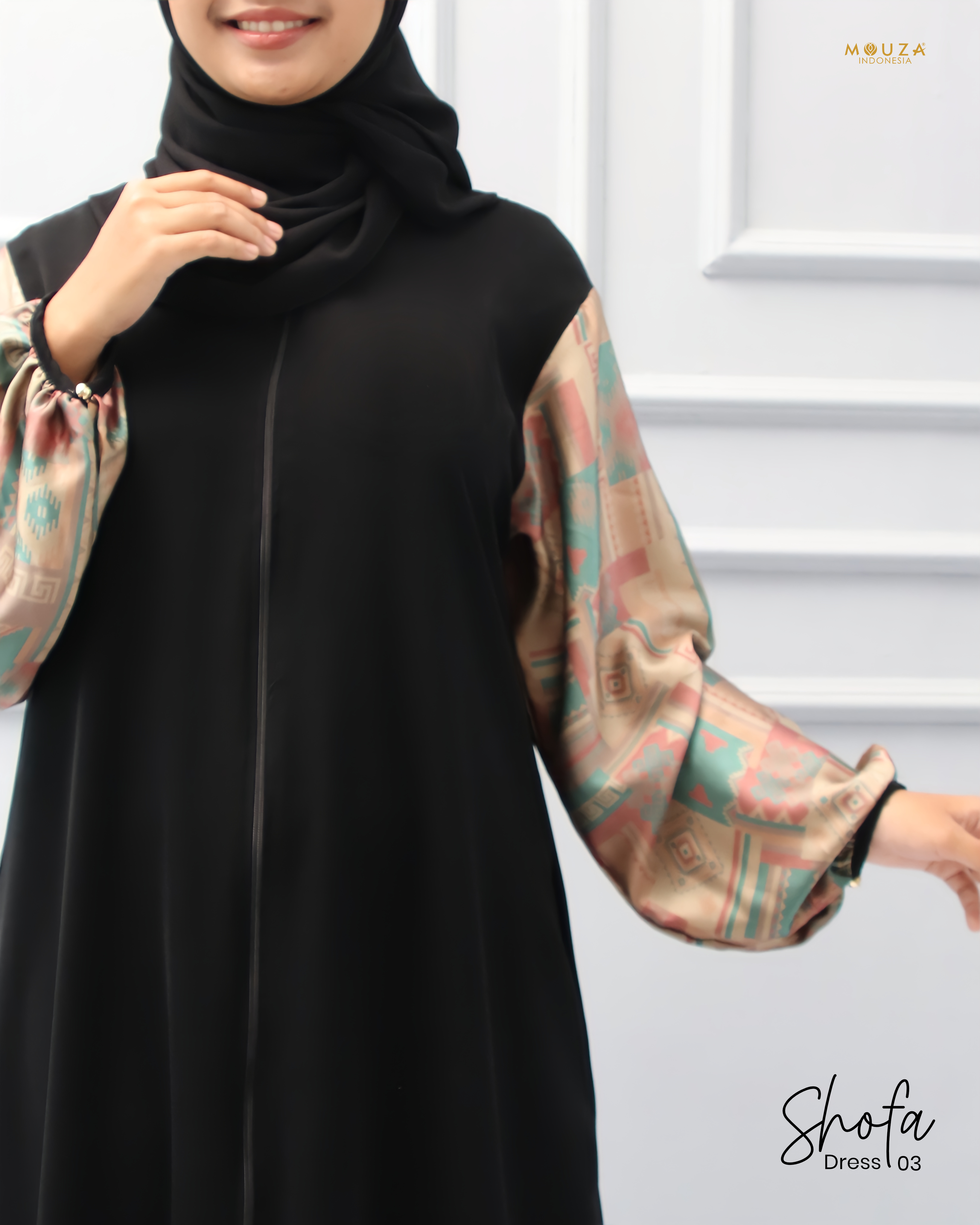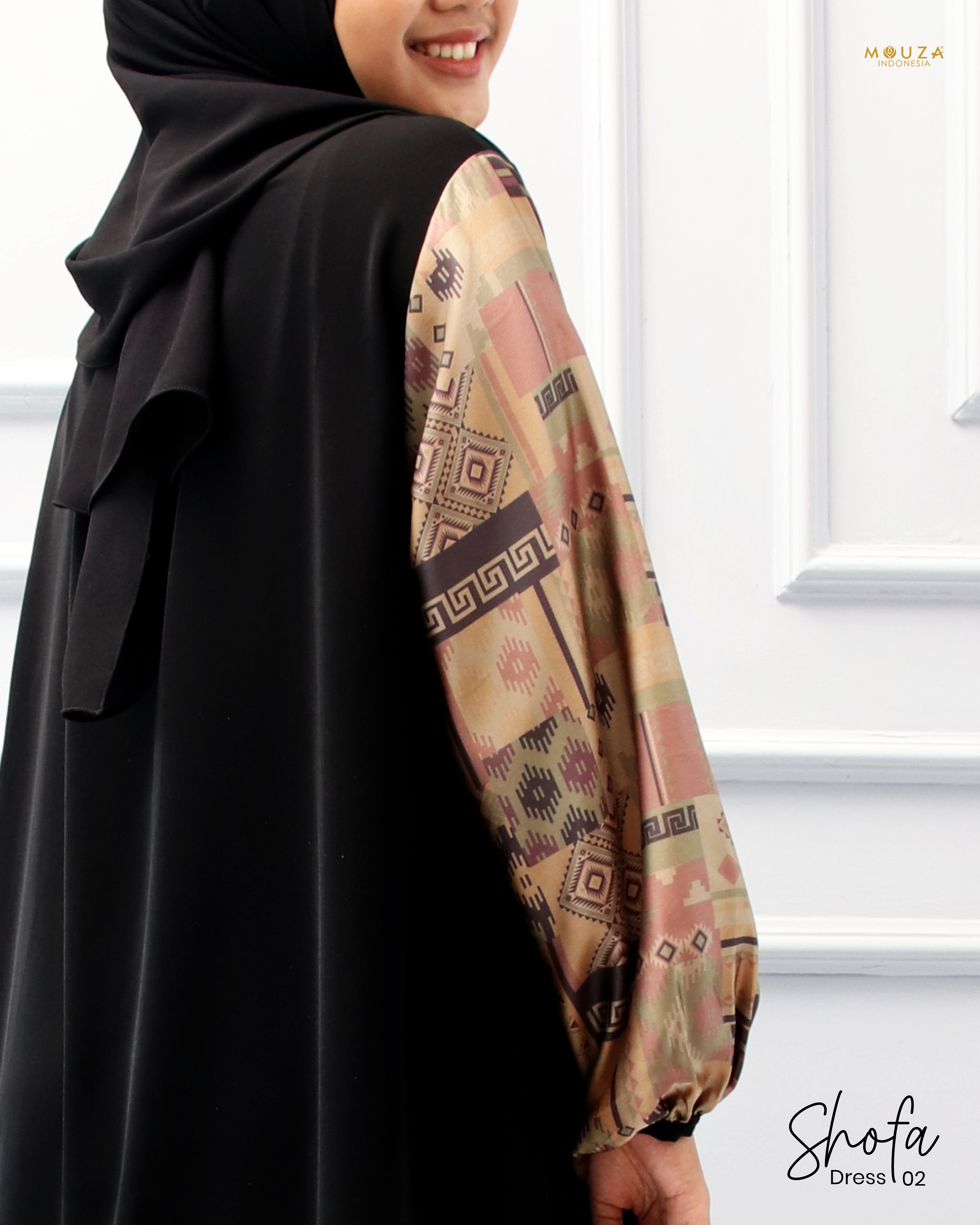 Shofa Dress menggunakan material pokka jetblack dengan karakteristik mempunyai serat yang lembut, adem dan mempunyai warna hitam pekat yang solid.