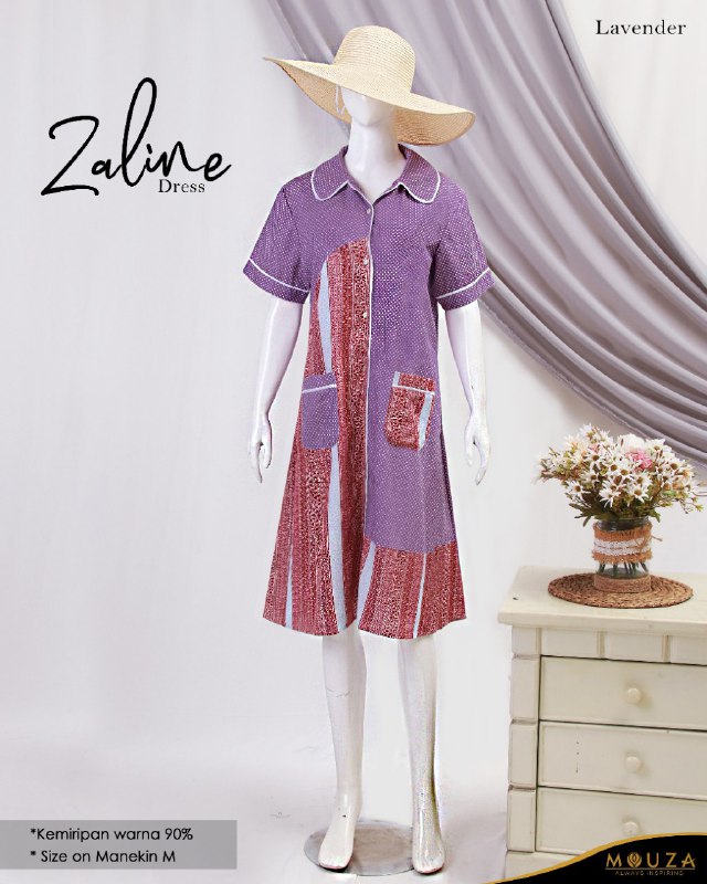 Zaline dress merupakan dress pendek dari Mouza bermaterial katun (motif polkadot) dan rayon (motif patchwork).